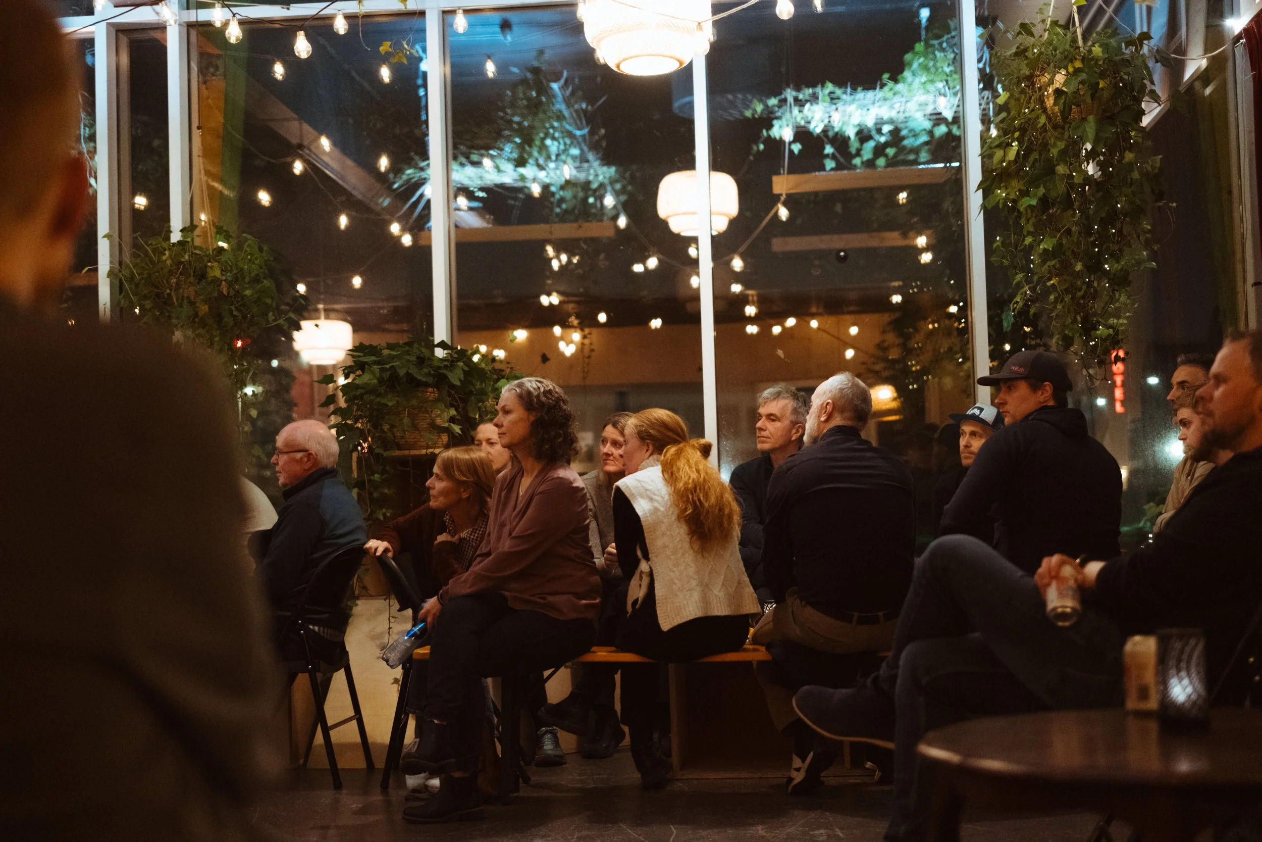 150 personer sittende i kino-oppsett